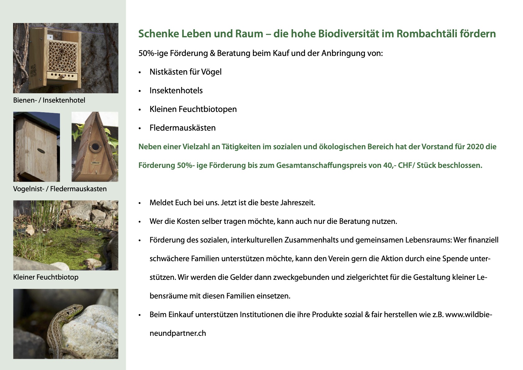 Wir sindim Frühjahr und Herbst in regnerischen Nächten mit einer kleinen, aber sehr aktiven Amphibienschutzgruppe unterwegs. Seitdem reduzieren sich die Totfunde von Tieren, für die unsere Strassen und die Barriere der vielen Häuser zur tödlichen Falle werden. In manchen Nächten konnten wir 36 Feuersalamander allein im Rombachtäli neben Kröten und Fröschen beobachten und Ihnen über die Strasse helfen. Wir helfen Ihnen zudem aus Abwasserschächten, sorgen für die Installation von Ausstiegshilfen und das Aufstellen von Hinweisschildern. Wenn Du dabei sein möchtest, melde Dich gern unter Kontakt bei uns. Wir würden uns sehr freuen.